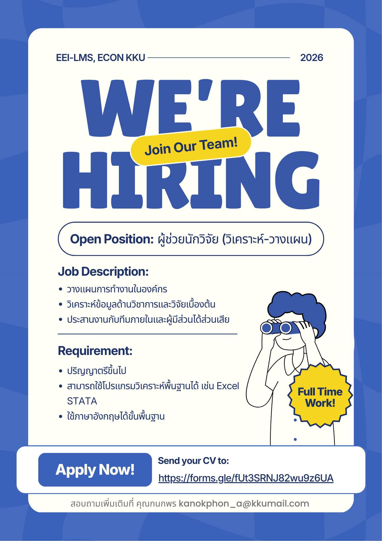 คณะเศรษฐศาสตร์ มหาวิทยาลัยขอนแก่น รับสมัคร ผู้ช่วยนักวิจัย (วิเคราะห์-วางแผน) ศูนย์วิจัย Economy and Environment Partnership for Lower Mekong Sub-Region (EEI-LMS)